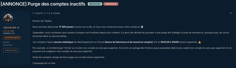 Attention pour ceux qui ont un compte inutilisé sur le tracker, il sera purgé d’ici demain soir 20 heures.