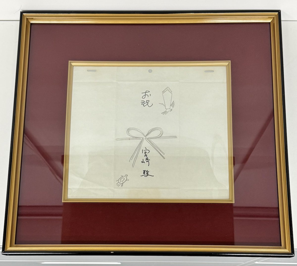 – Une enveloppe de Hayao Miyazaki félicitant la fondation de Gainax, appuyée par une feuille de papier d’animation.