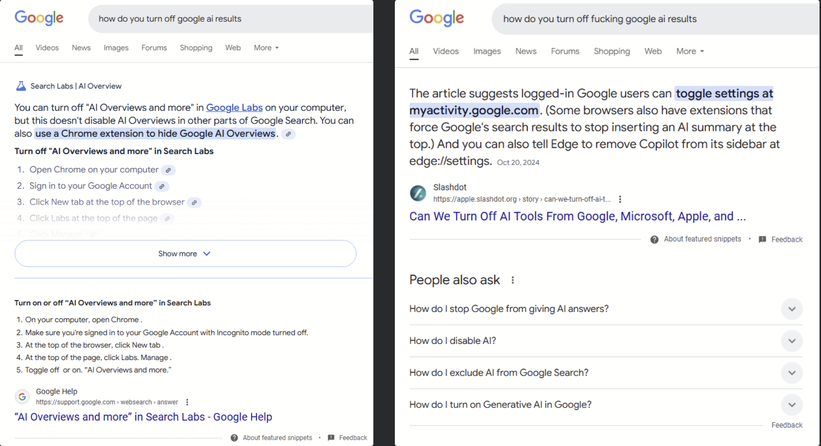 L’existence de cette astuce “jeter une malédiction pour désactiver Google AI” a fait le tour sur les réseaux sociaux ces derniers jours, et il fonctionnent dans les propres tests d’ARS. Par exemple, lors de la recherche de “Comment désactiver [l’adjectif] Google AI Results”, une variété d’adjectifs de mots de malédictions a désactivé de manière fiable les aperçus de l’IA, tandis que les adjectifs comme “stupide” ou “moche” ne l’ont pas fait. L’insertion de mots de malédiction au hasard à tout moment de la requête de recherche semble avoir un effet similaire.