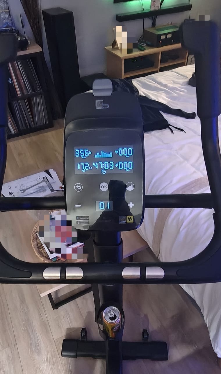 Je viens d’acheter un vélo d’appartement pour changer le mien sur lequel j’ai éclaté la courroie LOL et il n’était pas très adapté pour l’utilisation intensive que j’en fais.