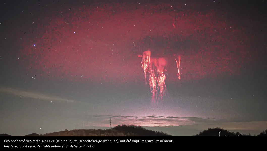 Il y a quelques semaines, un éclair particulièrement puissant a frappé la mer Adriatique, entre la péninsule italienne et les Balkans. Le champ électrique s’est propagé dans l’atmosphère sur des centaines de kilomètres, et au-dessus de la ville de Possagno, dans le nord de l’Italie, non loin de Venise, deux phénomènes atmosphériques rares se sont produits. Chose incroyable, ils ont été immortalisés simultanément sur une photographie.