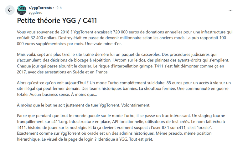 Pendant ce temps, C411 tourne tranquille et engrange le double de ce que YggTorrent faisait à son pic. Parce que la base utilisateurs est là, fidélisée, et que personne n’a fait le lien avec les anciens admins de YGG. Officiellement, ce sont des gens différents. Même si l’infrastructure, le code, la BDD et probablement les personnes derrière sont exactement les mêmes.