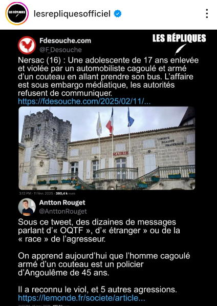 Que dire de certains merdias comme Français de souche, libre de dire tellement de conneries racistes et de laisser des gugus frustrés ayant la flippe que leur fille leur ramène un Mohamed à la maison, se lâcher dans leurs comm sans rien craindre :