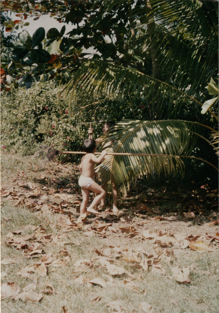 Toujours en Guyane, ma frangine de dos et moi caché derrière la feuille avec mon rateau. Insouciants comme des animaux.