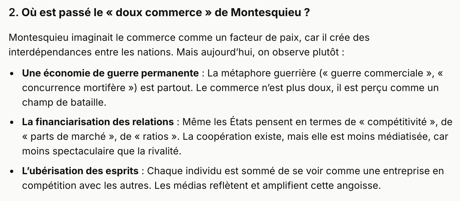 Nous sommes loin de la théorie du « doux commerce » de Montesquieu selon laquelle les échanges commerciaux entre pays favorisent la bonne entente politique et réduisent le risque qu’ils entrent en guerre.