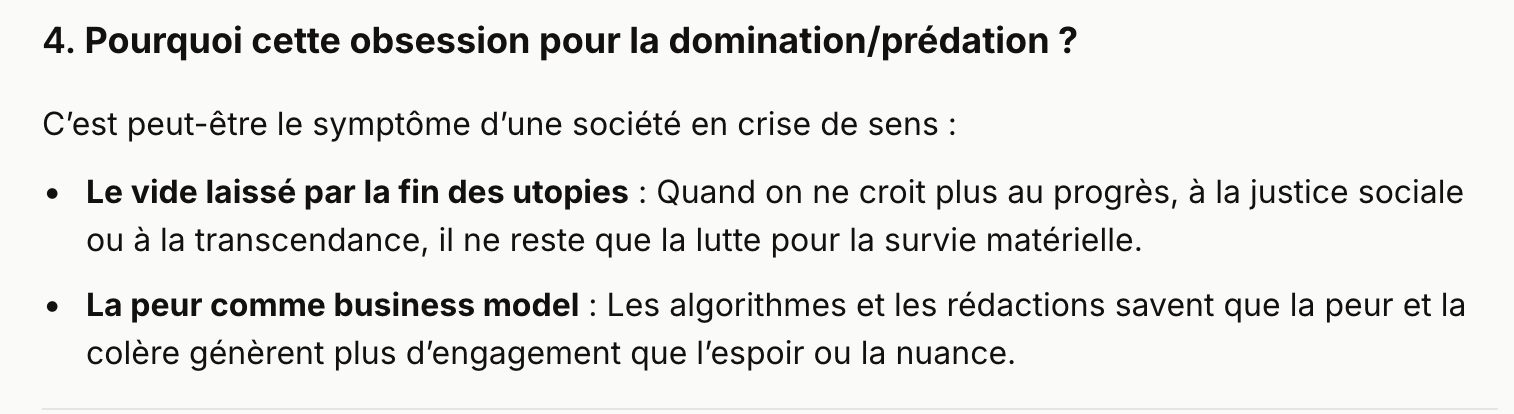 Par exemple, je lui ai demandé pourquoi les mots clés étaient le plus fréquemment utilisés sur les chaînes d’information publiques et privées : tels que « euros », économie », « pourcentages », « crises », « pouvoir d’achat », « épargne », « compétition », « concurrence féroce et déloyale mortifère », « peur du lendemain », « le pognon est le nerf des guerres territoriales et commerciales » et autres considérations matérielles et de domination/prédation plus que pacifiques.