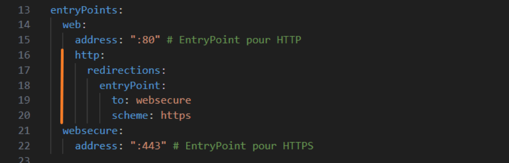 entryPoints: web: address: ":80" # EntryPoint pour HTTP http: redirections: entryPoint: to: websecure scheme: https websecure: address: ":443" # EntryPoint pour HTTPS